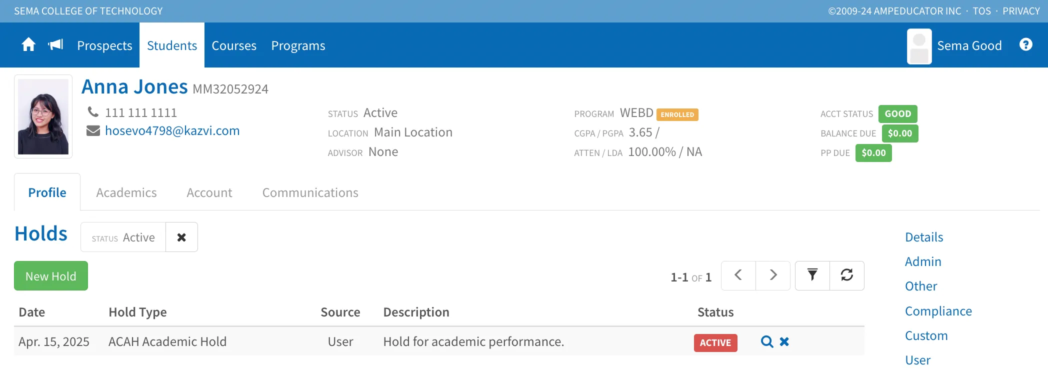 the student holds feature helps you manage student access and communication more effectively by flagging academic, financial, or attendance related issues directly on the student profile holds can limit what a student can do and make it easier for staff to track and resolve problems quickly you can access and configure hold types under institution config / students / holds adding or editing a hold type to create a new hold type, click new hold type you can also click the edit icon next to any existing hold type, including the defaults, to update its settings a modal will appear where you can define or update the details of the hold you’ll need to fill out the following hold reason code – a short code to identify the hold (e g , acah for academic hold) hold reason – the name of the hold type that will display in the system hold description – (optional) add more detail to explain the reason or purpose of the hold below that, you can select which student actions will be disabled when this hold is applied check the disable box next to any of the following options academic history – prevents the student from viewing their academic history course grades – blocks access to viewing final grades program audit – disables the student’s ability to run a program audit self enroll – stops the student from enrolling in courses on their own click add to save the new hold type or update to save changes to an existing one automatic holds based on thresholds in addition to manually applying holds, ampeducator allows you to set up automatic holds based on specific thresholds you define when a student falls below one of these thresholds, the system can automatically apply a hold and notify the appropriate staff these thresholds can be configured in the following areas academic hold – go to docid\ lav0vg ekp0iaqaukl8i to set gpa or grade related thresholds attendance hold – go to docid\ fez7dwotdffln5bnyaifc to set minimum attendance percentages balance & payment plan holds – go to docid\ buuwjuq9qxbwvqefuzkqn to set financial thresholds based on outstanding balances or overdue payment plans once configured, ampeducator will automatically monitor these criteria if a student no longer meets the minimum requirement, a hold will be applied to their profile, and notifications will be sent based on your settings this feature helps staff proactively manage issues before they escalate and ensures students are flagged in real time without requiring manual review manually applying a hold to a student to manually place a hold on a student, go to their profile and open the holds tab from the left side menu click the new hold button to open the hold entry modal fill out the following fields hold date – the date the hold becomes effective hold type – select from your list of configured hold types hold notes – (optional) add context or a reason for the hold email notification – check this box to notify the student by email when the hold is applied click add hold to save and activate the hold it will appear in the student’s holds list with a status of active you can view the details of a manual hold by clicking the view hold (magnifying) icon next to it, or click the delete hold (x) icon if the hold is no longer needed